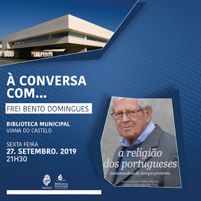 No próximo dia 27 de Setembro (2019), sexta feira, às 21.30 horas, na Sala Couto Viana da Biblioteca Municipal de Viana do Castelo, vamos estar à conversa com FREI BENTO DOMINGUES a propósito do seu mais recente livro intitulado "A Religião dos Portugueses".